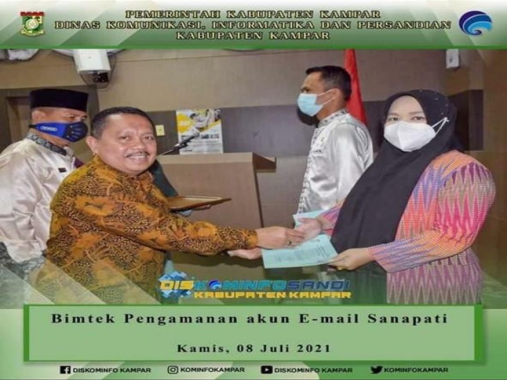 Bimbingan Teknis Penyelenggaraan Persandian untuk pengaman Informasi Pengelolaan akun E-mail Sanapati, sekaligus penyerahan E-mail, penyerahan Password dan keamanan Imformasi Pemda kampar tersebut secara resmi dibuka Bupati Kampar H Catur Sugeng Susanto,SH,MH melalui Plt Kadis Kominfo yang diwakili Kepala Bidang Persandian Ir Rahmad Junaidi di ruang rapat lantai III Kantor Bupati Kampar, kamis (8/7/21).